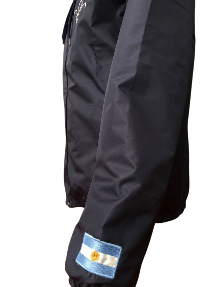 La campera cuenta además con la bandera argentina bordada en la manga, aportando identidad y un detalle distintivo.