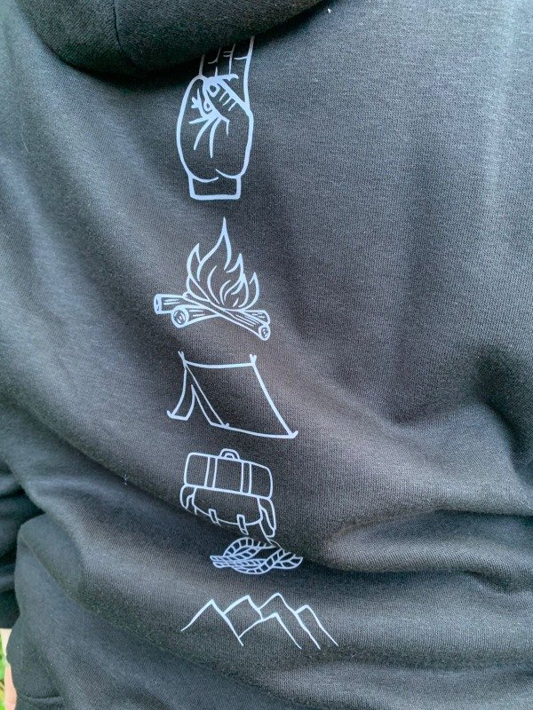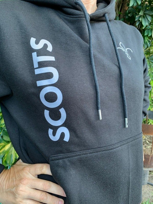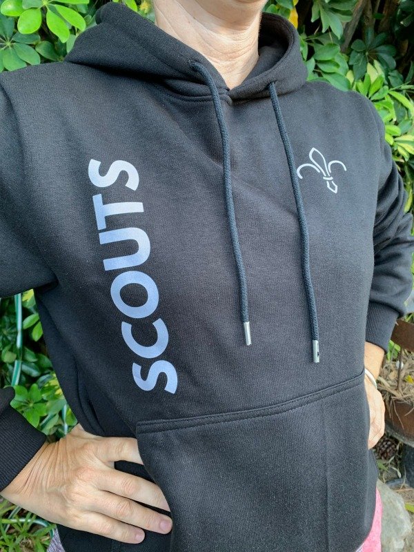 Buzo negro con capucha y bolsillo canguro en frisa clásica. Estampado en DTF gris en frente y espalda.