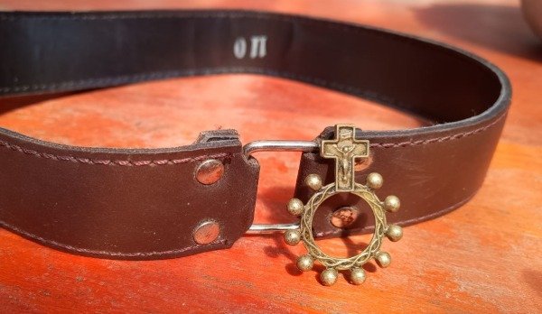 Denario metálico. Medidas: 4 cms de alto (incluye cruz) x 3 cms de ancho. Terminación: baño bronce viejo